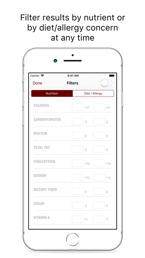Apply filters to highlight foods that fall within specific nutritional ranges (i.e., between 0 and 20 calories), and restrict the results to foods meeting certain dietary choices (i.e., vegetarian, not soy allergy). Or search for a food directly by name and see when and where it is served.
