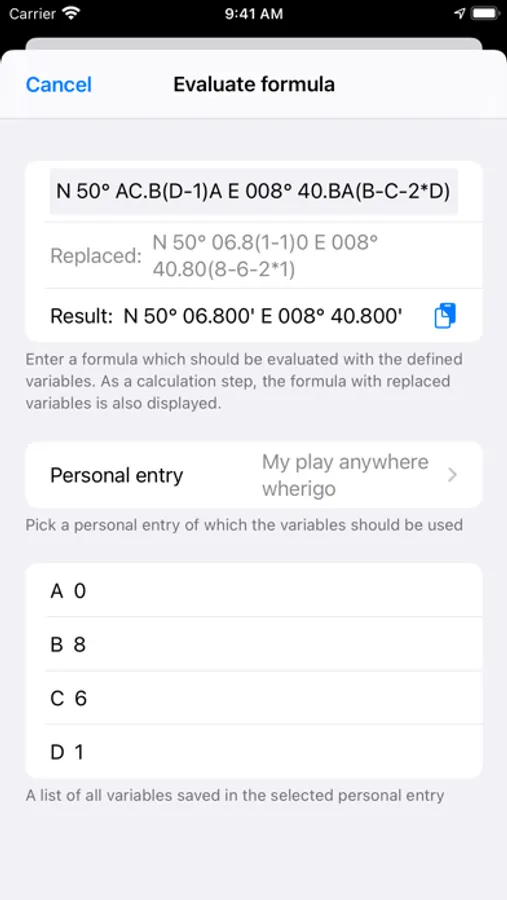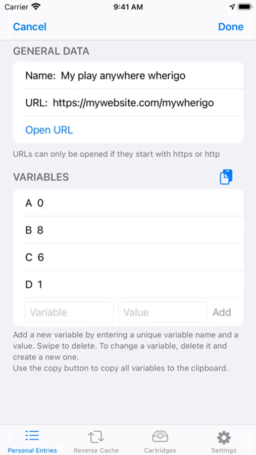- organise variables and values from played Play Anywhere Wherigos in a table with detail view as personal entries