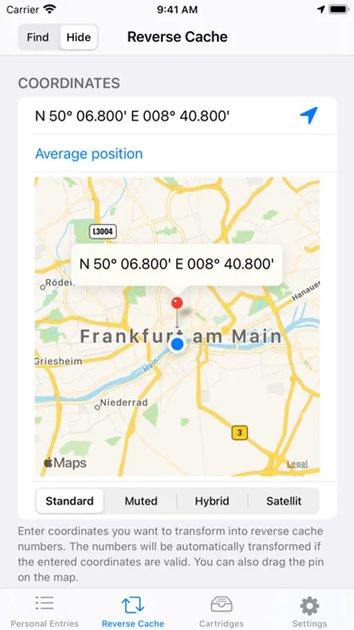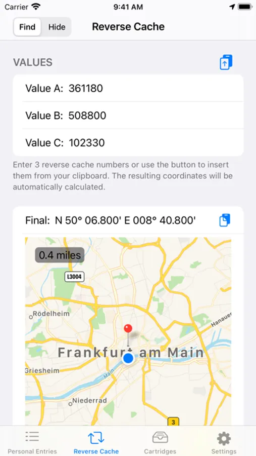 - offline calculation of three 6-digit numbers to coordinates and placing result and own position* on a map** (find reverse wherigo easily and offline)
