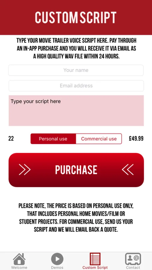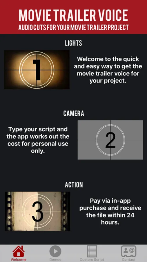 Type your Movie Trailer Voice script, Pay through an in-app purchase and you will receive it via email as a high quality wav file within 48 hours.