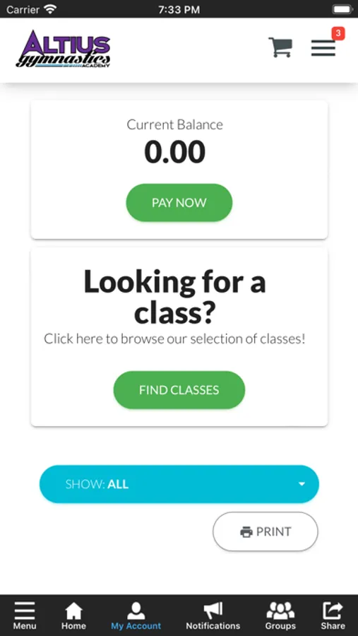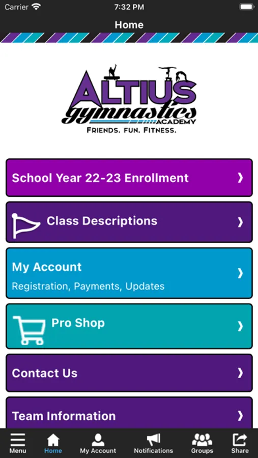 The Altius App is linked to your existing parent portal account, and provides live information on class and event availability. Sign up or makes payments on the go! You can also view the upcoming calendar, find us on social media, and stay up to date on sales, announcements, and gym closures through push notifications.