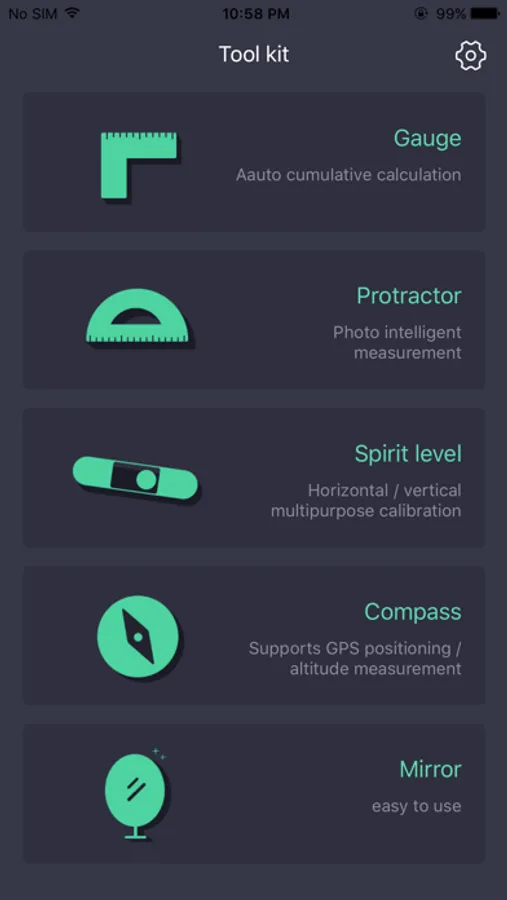 The toolbox is a collection of a variety of gadgets, it contains a ruler, a protractor, level meter, compass, mirror etc..