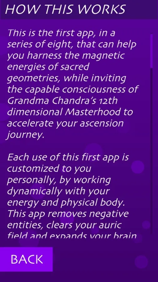 This is the first in a series of eight apps that helps you harness the magnetic energies of sacred geometry and the capable consciousness of Grandma Chandra’s 12th dimensional masterhood. Sacred geometry magnetic energies are invaluable in that they assist you in attracting more light to you as energy and information. Each interaction with this first app dynamically adapts to where you currently are on your ascension path, helping you to remove negative energies, focus your mind to make clearer decisions and expand your brain usage.