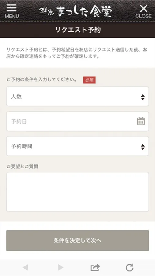 宴会などのお席の日時を指定して送信するだけで予約を依頼できます。