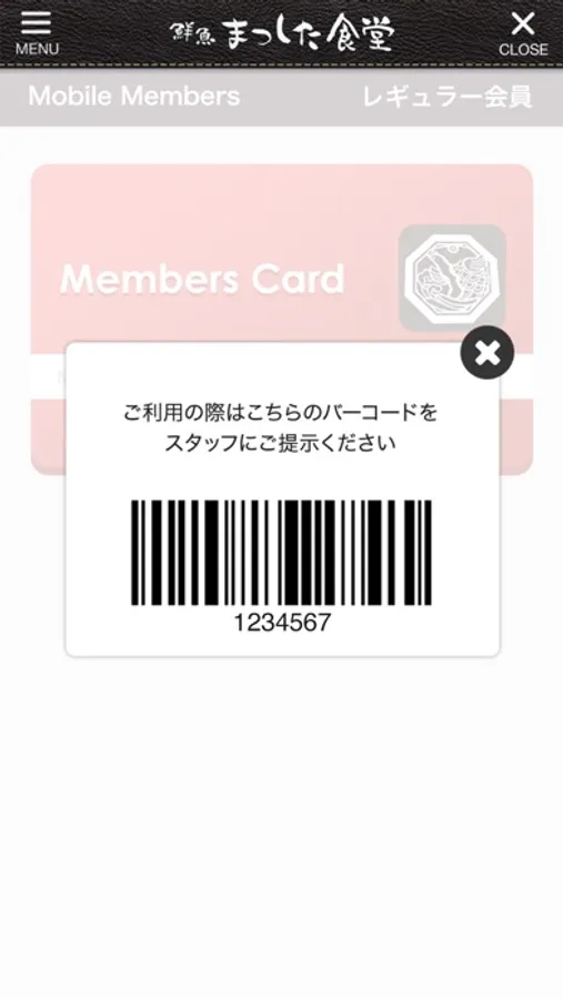 「会員番号バーコード」の表示機能は、店頭でのお買い上げ時に提示することで、スムーズな会計が可能です。