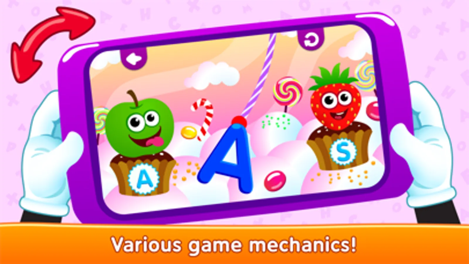 Caramel rope. Turn the gadget from side to side, swing the yummy letter on the caramel rope and feed the jolly character.