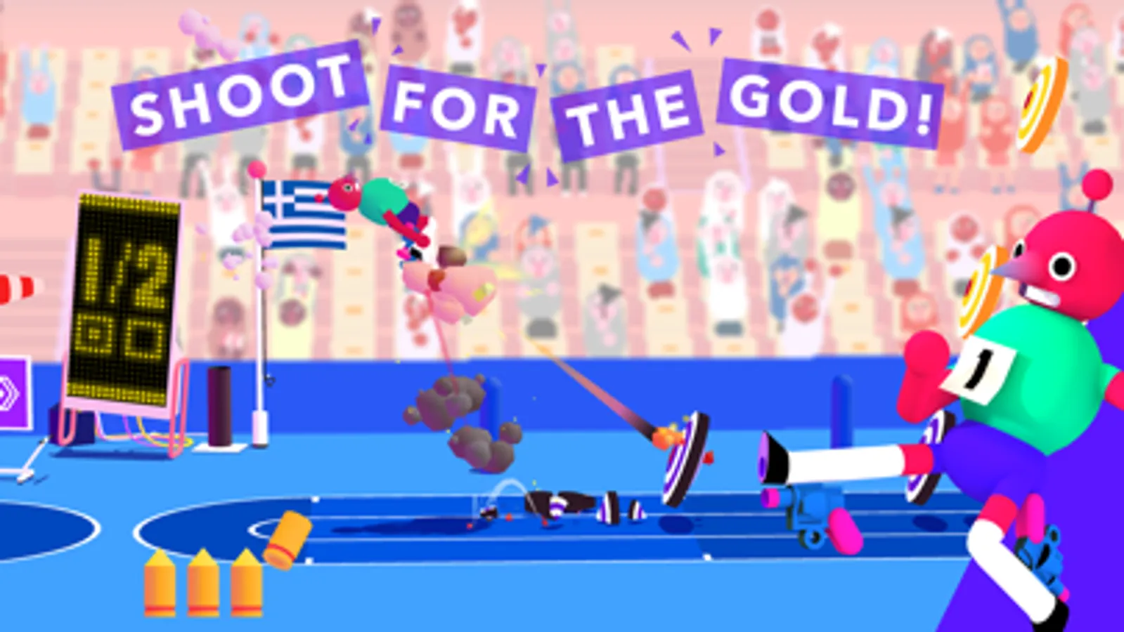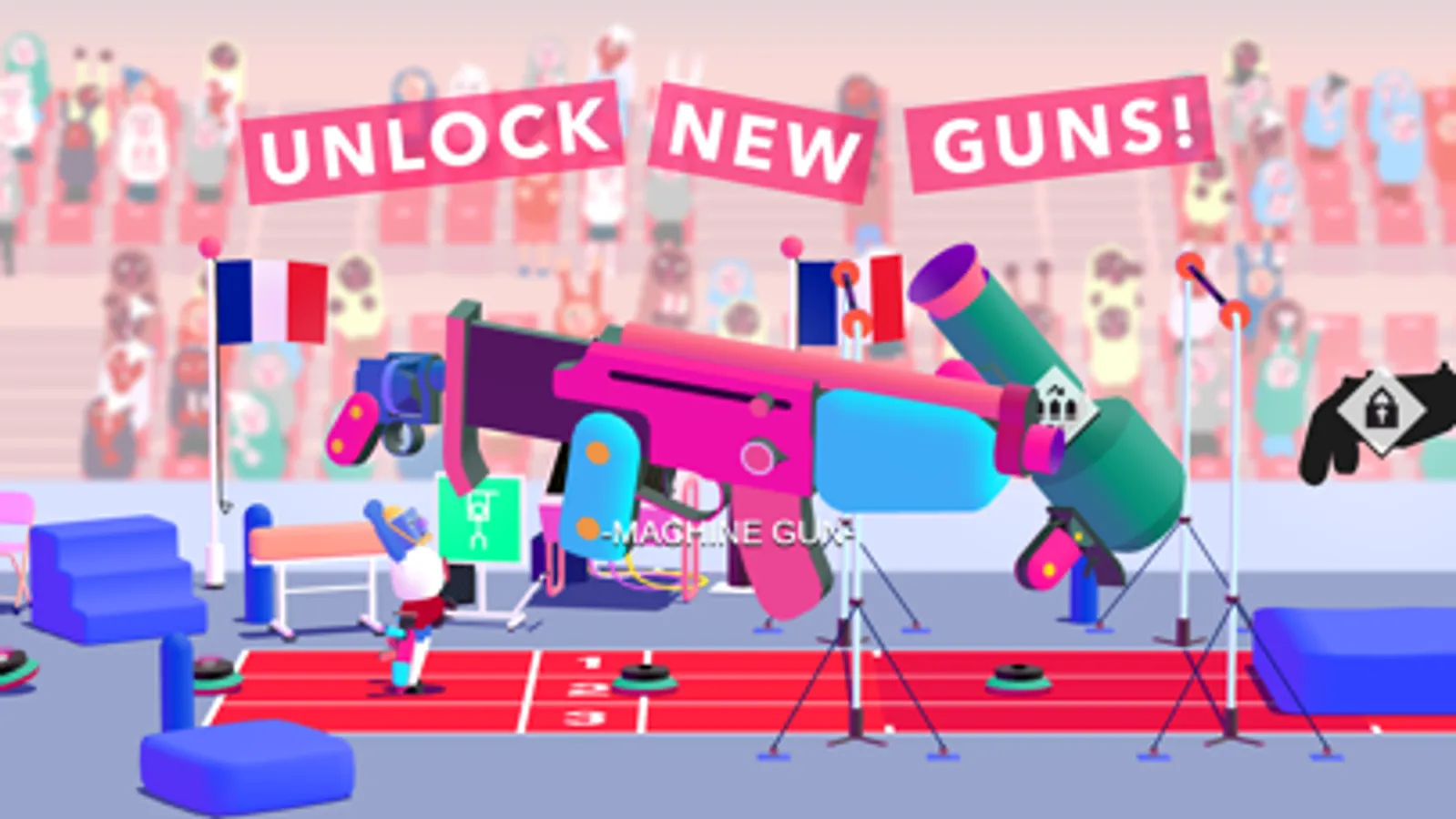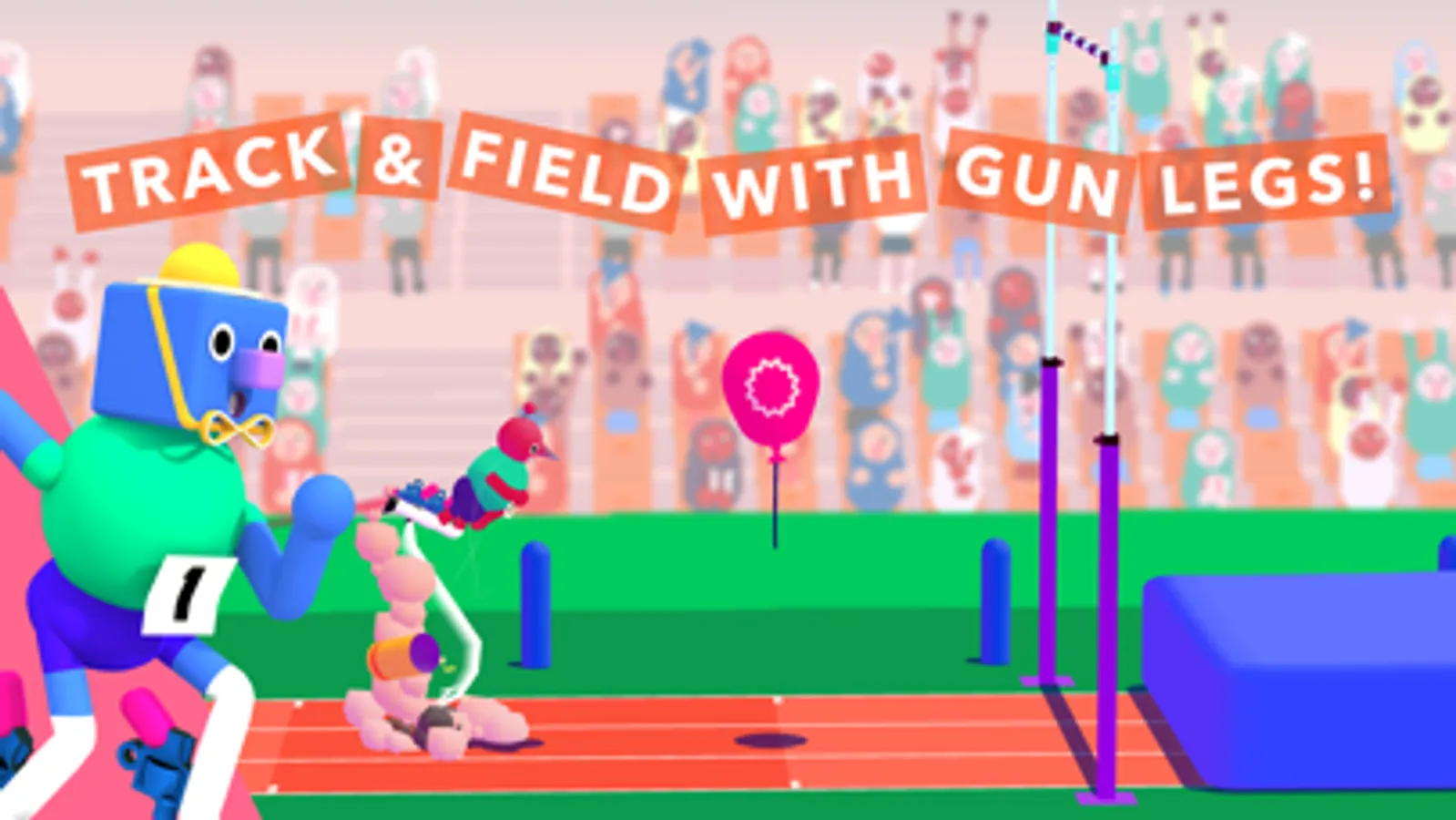 Attaching guns to your legs has revolutionized track and field competition forever! The recoil from your gun legs will send you flying over the running track. Pulverize those world records! Experiment with using the bazooka legs and fly even higher!