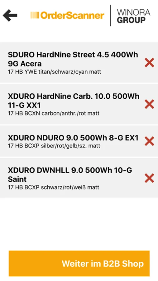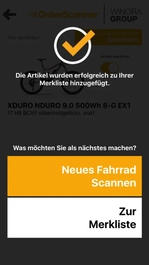 After you have installed and signed in with your B2B dates, you can start immediately: All new products and displayed bikes have an individual QR code. You only have to scan the QR code via the OrderScanner app and add the selected bike to the watch list. The OrderScanner app automatically synchronizes your watch list with the OrderCenter, the new online order platfrom of Winora Group. In the OrderCenter, you can review your watch list, all bike details, conditions and delivery dates and complete your order.