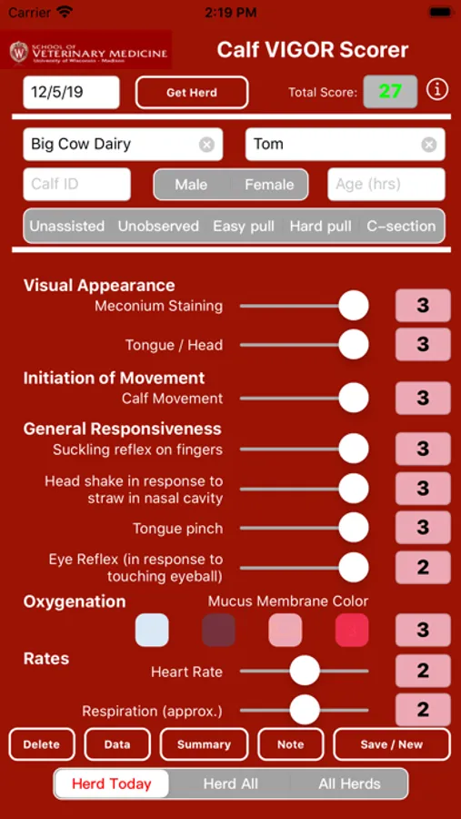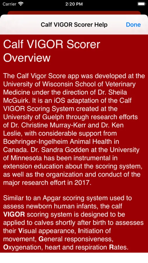 The Calf Vigor Score app was developed at the University of Wisconsin School of Veterinary Medicine under the direction of Dr. Sheila McGuirk. It is an iOS adaptation of the Calf VIGOR Scoring System created at the University of Guelph through research efforts of Dr. Christine Murray-Kerr and Dr. Ken Leslie, with considerable support from Boehringer-Ingelheim Animal Health in Canada. Dr. Sandra Godden at the University of Minnesota has been instrumental in extension education about the scoring system, as well as the organization and conduct of the major research effort in 2017.