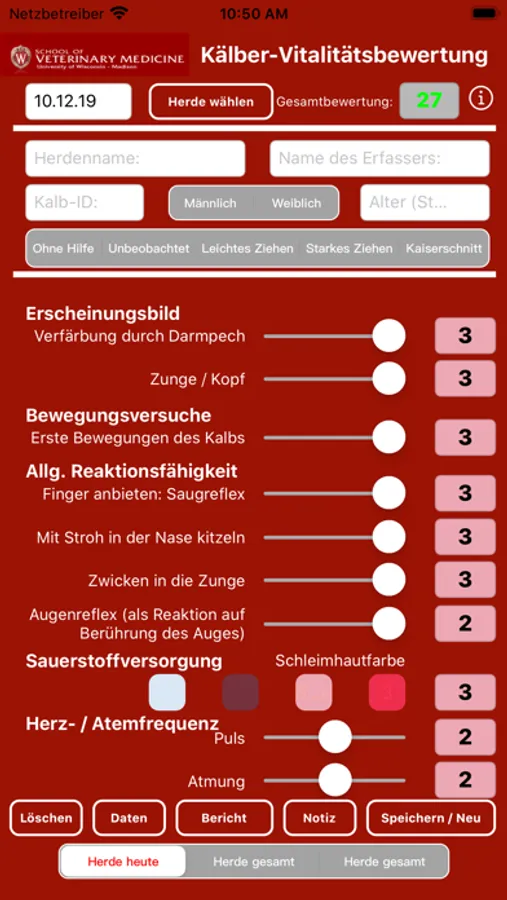 The input categories include meconium staining, appearance of the tongue, time to initiation of selective calf movements such as sitting, standing attempts, suckling, head shaking, tongue withdrawal after a pinch, and eye blinking. Mucous membrane color, heart and respiration rates are additional clinical signs that are assessed and assigned scores ranging from 0 to 3. The higher the score, the more vigorous the calf: