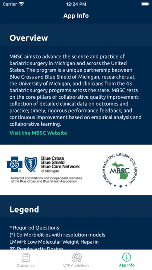This mobile application delivers healthcare providers an easy-to-use resource for predicting outcomes and VTE risk for bariatric surgery candidates. Predicted outcomes include projected weight loss, complication risk, and resolution of comorbidities for the most common bariatric surgical procedures. The VTE calculator provides risk-stratified treatment guidelines. The content was developed by the Michigan Bariatric Surgery Collaborative (MBSC), a Blue Cross Blue Shield/ Blue Care Network of Michigan sponsored consortium of bariatric surgeons and hospitals across the state of Michigan.