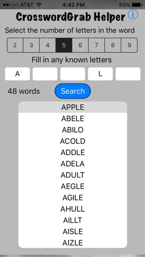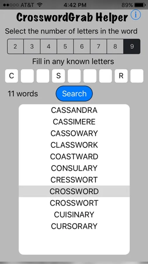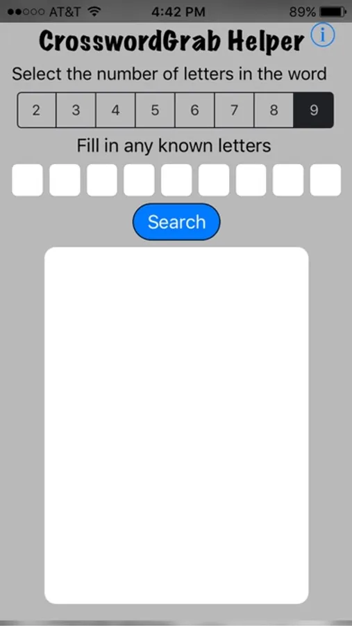 Simply indicate how many letters the mystery word contains then fill in the letters you know to be correct and let Crossword Grab Helper do the rest. A list of matching words for the pattern you have provided appear, allowing you to find the correct word for the crossword clue! If the app is opened from the Crossword Grab app, the letters of the highlighted word in the puzzle are automatically filled in and a search is performed.
