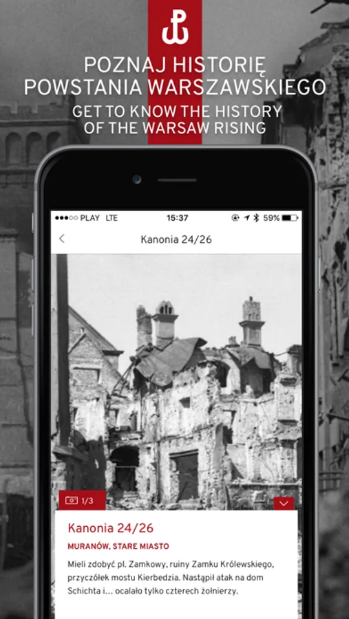 This app consists of archival photographs from the collection of the Warsaw Rising Museum as well as contemporary photographs. For 30 selected sites, we have also prepared audio recordings, read by Sonia Bohosiewicz. All sites are marked on a map in their respective districts. Using geolocation you can find each place and easily navigate through the city.