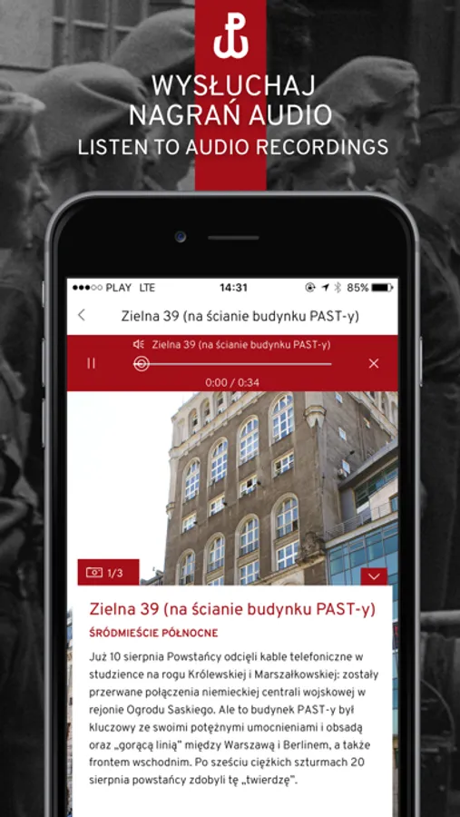 This app is an attempt to rescue from oblivion the monuments, statues and plaques commemorating Warsaw insurgents and residents of fighting Warsaw and it provides a chance to get to know their history. It is a collection of about 370 sites related to the Warsaw Rising, accompanied by short descriptions showing historical events and the fate of people living in German occupied Warsaw.