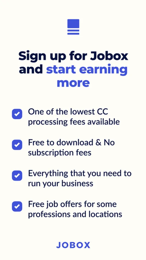 Jobox is the ultimate business management app for skilled trades professionals. Manage all parts of your business directly from your phone. Pay less in fees while getting discounts and cashback on inventory through selected partners. And for eligible pros, you can even get free jobs sent straight to your phone. No lead gen fee, no subscription - you only pay when you get paid. Earn more money, on your own terms.