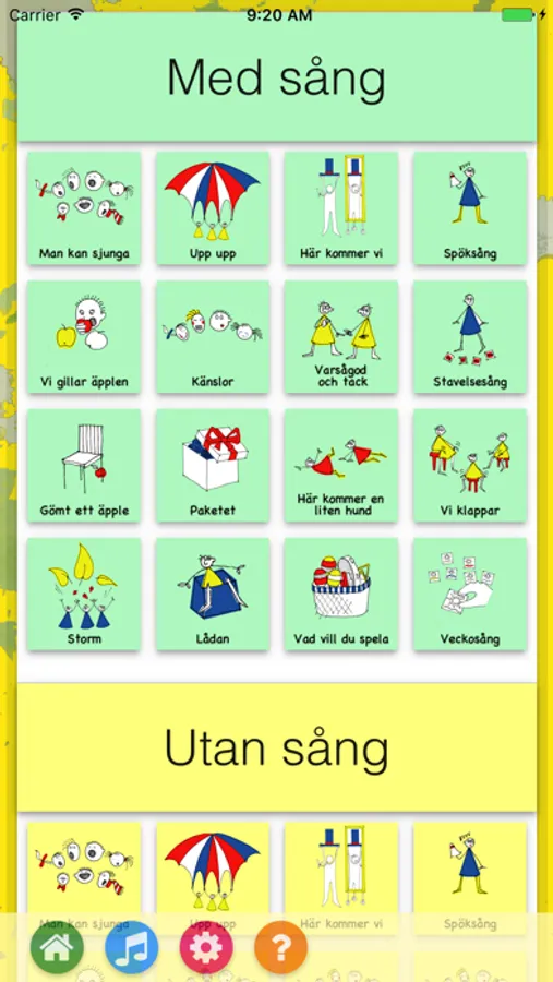 I appen finns de sånger som används i det pedagogiska materialet ”Man kan sjunga på många olika sätt”. Detta sångläromedel hittar du hos Isaberg förlag.