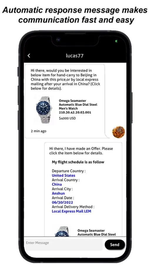 • CARRIER - Input travel plan, search for Buyer’s posting, communication with Buyer, price and payment settlement with Buyer through Alipay or Credit Card with Stripe payment engine in SkyBay platform, hand-carry product to Buyer based on travel destination, or ship product by local express mail after your arrival.