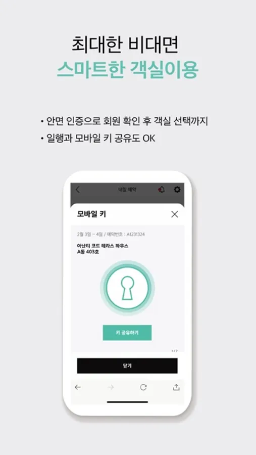 - 외출할 때마다 카드키 나눠 갖기 수고스럽죠. 모바일 키를 일행과 공유해 편하게 오가실 수 있어요.