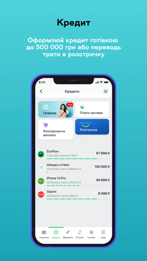 Обирайте в розділі “Кредити” розстрочку або кредит готівкою.