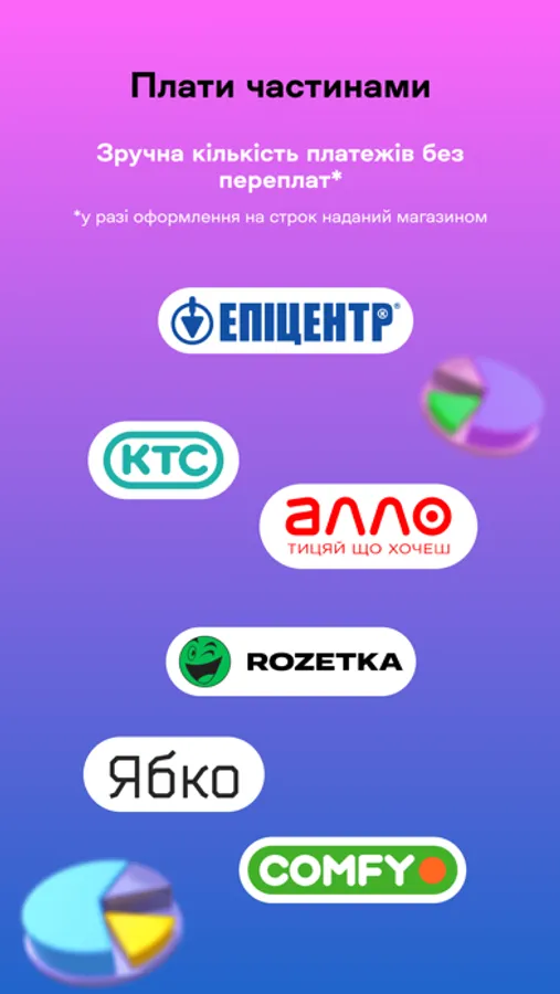 Оформлюйте товари та послуги в магазинах наших партнерів з сервісом “Плати частинами" без переплат!