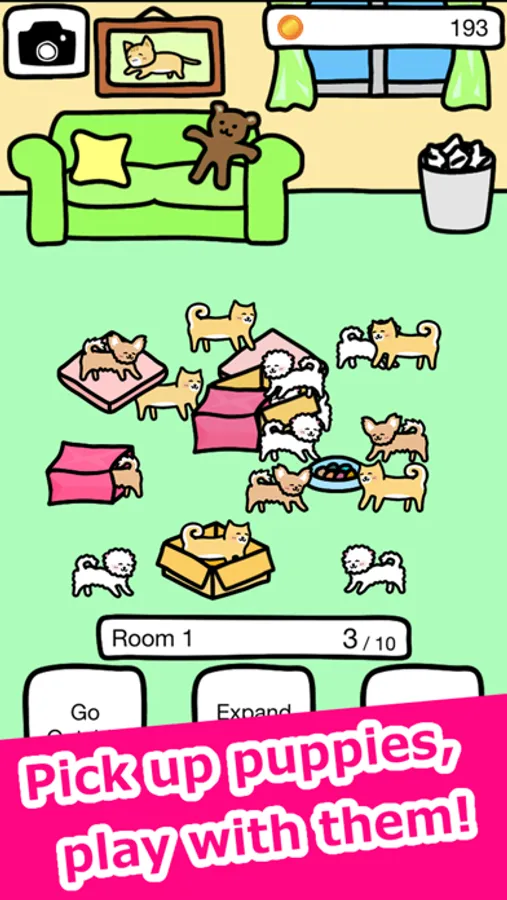You can get coins by stroking puppies in rooms, so collect many puppies!