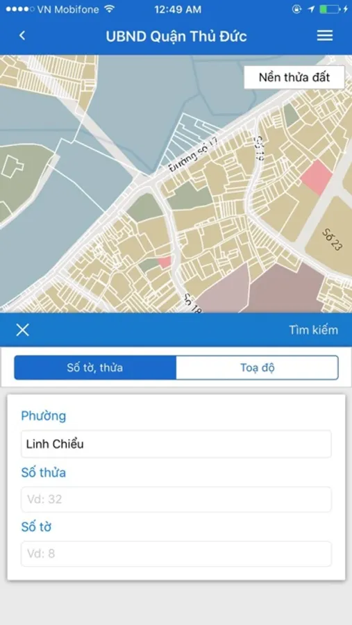 + Tìm kiếm thông tin thửa đất theo Số tờ, số thửa hoặc theo Toạ độ.