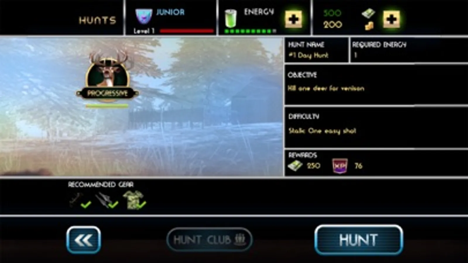 The simulation contains over 100 hunts, with increasing difficulty, requiring better and better equipment, techniques, and hunting expertise.