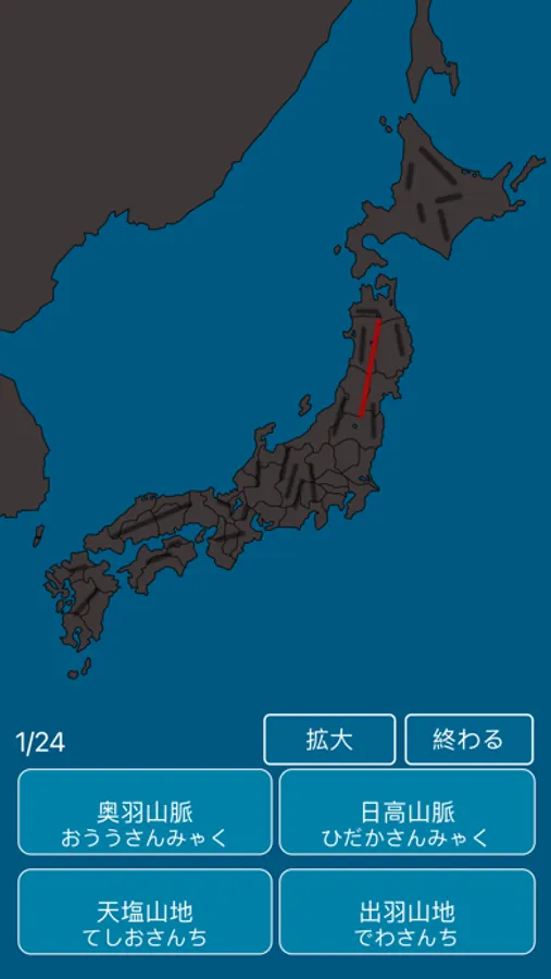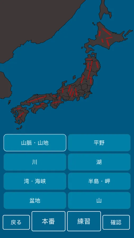 日本の基本的な山脈、湖、半島、湾、盆地、川、山の名前と位置を覚えることができる地理クイズアプリです。