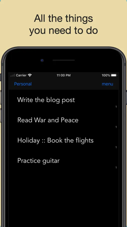 • Lists to divide tasks into separate contexts (such as work, personal, errands)