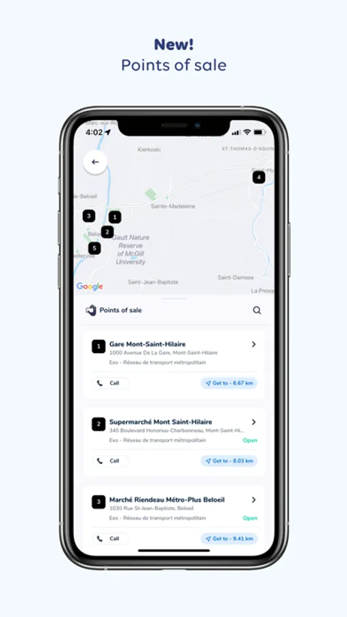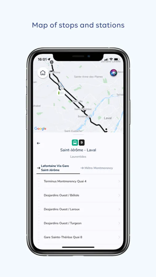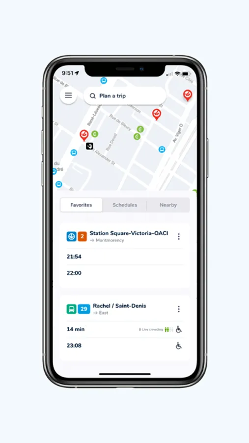 - Display the position of bus stops, metro stations, train and REM stations near you**.
