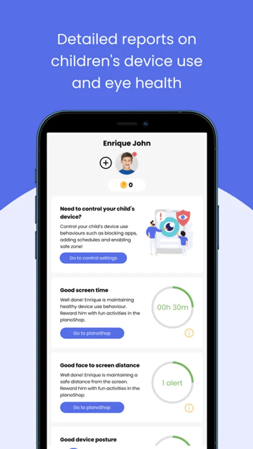 • Detecting safe face-to-screen distance: The planoApp will remind your child to hold their device at least 30cm away from their eyes.
