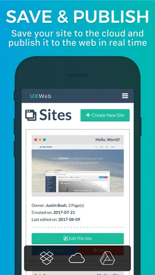 Save, sync and publish your website from the cloud. UXWeb offers multiple export, as well as free-sync options with services such as Dropbox, iCloud, Files, Google Drive, OneDrive and any 3rd-party cloud platform with sync capability. Furthermore, UXWeb offers an industry-leading Time Capsule feature with autosave cloud integration, allowing users to restore their site to a prior backup in seconds.