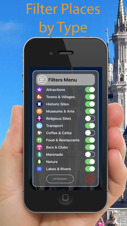 Categories that can be viewed and selected include Tourist Attractions, Hills, Lakes, Parks & Woodlands, Cities, Towns, Suburban Areas, Villages & Hamlets, Cafes, Restaurants, Cafes, Airports, Train & Major Bus Stations, Municipal Buildings, Places of Worship, Historic Sites and Museums & Arts.