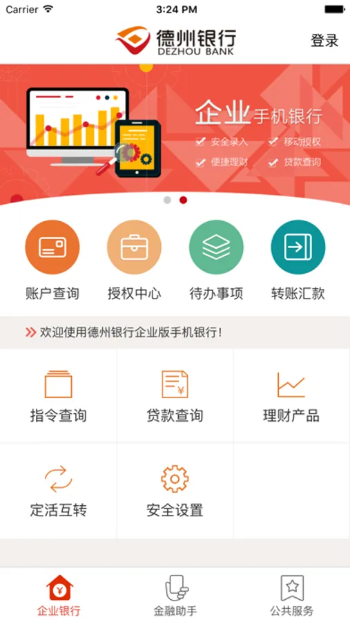 德州银行企业版手机银行是基于德州银行网上银行的相关功能,遵循企业网银相关业务规则、业务流程、审批机制而开发的新一代手机银行产品。该产品围绕“高效、便捷、智能、安全”四大核心目标,操作简单,界面美观,为企业客户提供账户统一管理、移动审批、增值资讯、智能提醒等丰富功能,让用户享受移动金融新体验。