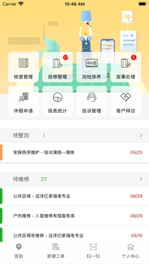 该APP包括多个模块,基本涵盖物业相关各个岗位的工作人员日常上班的所有工作任务:
