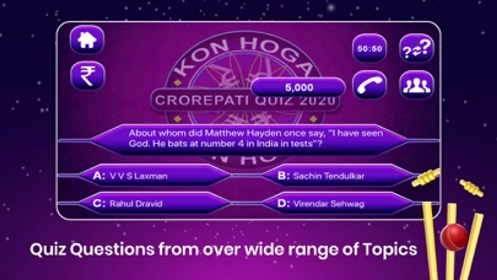 - Crorepati Quiz Game with questions on various topics like GK (General knowledge), History, Indian History, Cricket Quiz, Bollywood Quiz, International quiz and more