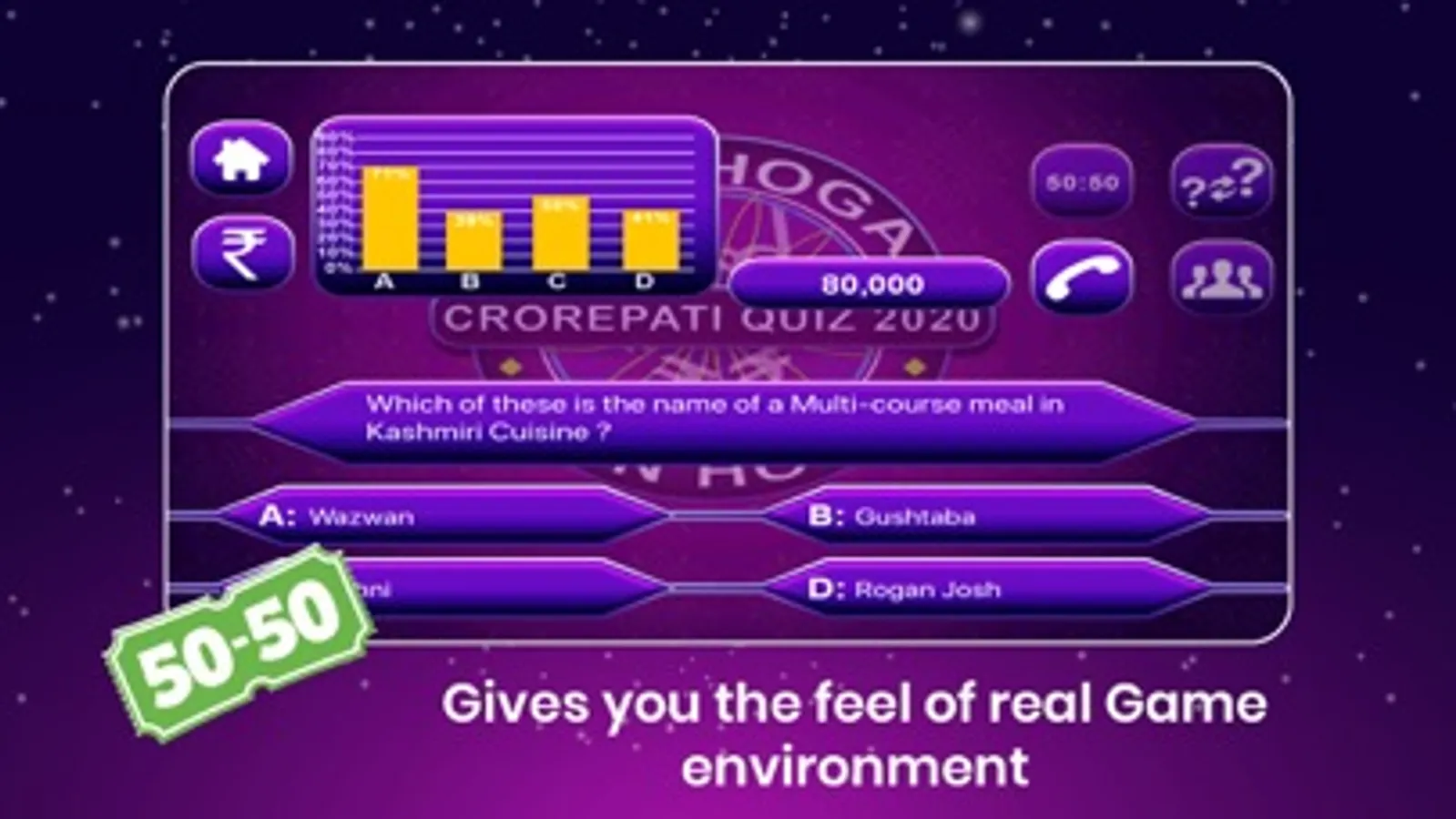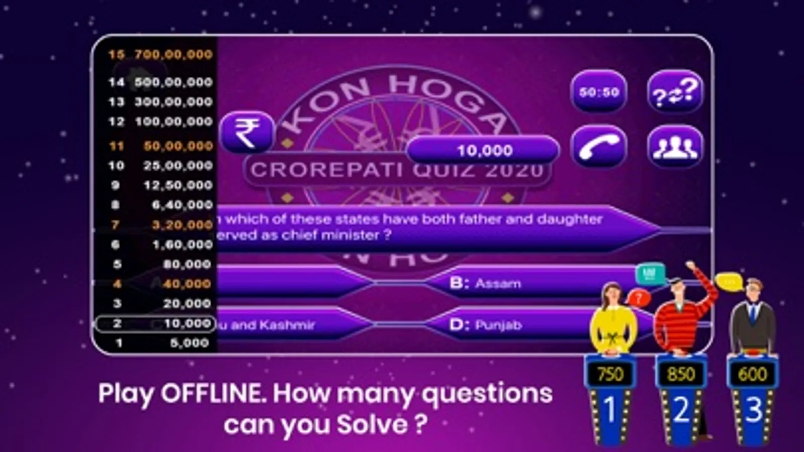 Crorepati Quiz in Hindi & English & many more regional languages. Made on the concept of famous Game show Kaun banega crorepati, this game will give you the feel of real environment to prepare for KBC 2020