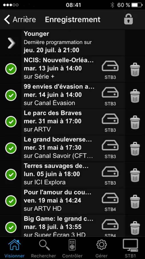 5) et, pour les abonnés qui ont un ou des décodeurs enregistreur de Cooptel, contrôler l’appareil à distance pour gérer les émissions que l’on désire enregistrer ou effacer dans l’appareil. De plus, on peut voir la liste des enregistrements captés sur l’appareil ainsi que celles qui sont cédulées à être enregistrées. Si vous avez plus qu’un décodeur, vous pouvez aussi sélectionner celui que vous désirez contrôler.