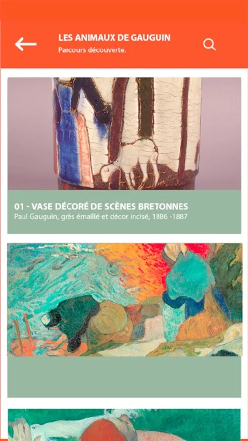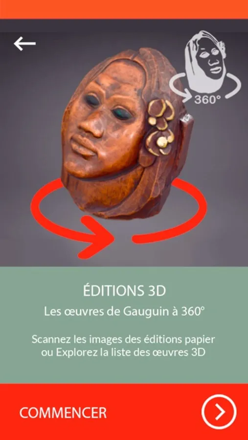 4-Éditions 3D. Scannez des œuvres de l’artiste à partir des éditions de la Rmn-Grand Palais publiées à l'occasion de l’exposition ou sélectionnez-les dans la liste proposée. Plongez dans les dessous et les dessus des œuvres de Paul Gauguin conservées au musée d’Orsay. Manipulez une trentaine d’œuvres sculptées ou peintes dans tous les sens grâce à des vues en 3D et à 360°.
