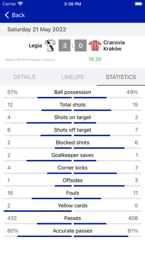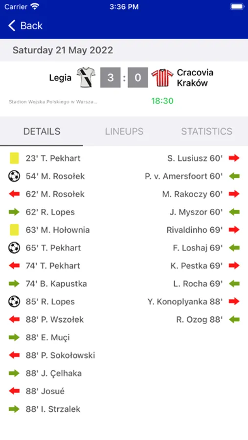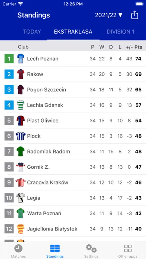 Live Scores for Ekstraklasa 2023/2024 is the app that will allow you to follow the matches of Football Championship in Poland, even you do not have possibility to watch TV or live stream. It includes a schedule of matches, standings and results of Ekstraklasa, Division 1, Polish Cup and Super Cup. With the application you will not miss a goal or begin of a match, because it will send you a notifications. You can select favorite matches and receive notifications only for them. In Ekstraklasa season 2023/24 play the teams: Ruch Chorzow, Jagiellonia, Lech Poznan, Legia, Zaglebie, Rakow, Widzew Lodz, Warta Poznan, Pogon Szczecin, Stal Mielec, LKS Lodz, Cracovia, Slask Wroclaw, Korona Kielce, Piast Gliwice, Puszcza Niepołomice, Radomiak Radom and Górnik Zabrze.
