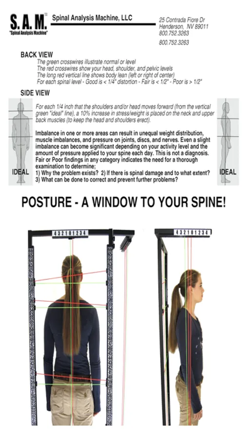 The SAM Posture Print App is used with a Spinal Analysis Machine (SAM) to document & explain posture as an indication of spinal health. The SAM (machine) provides a posture grid analysis comparing "ideal" posture to the actual posture exhibited by an