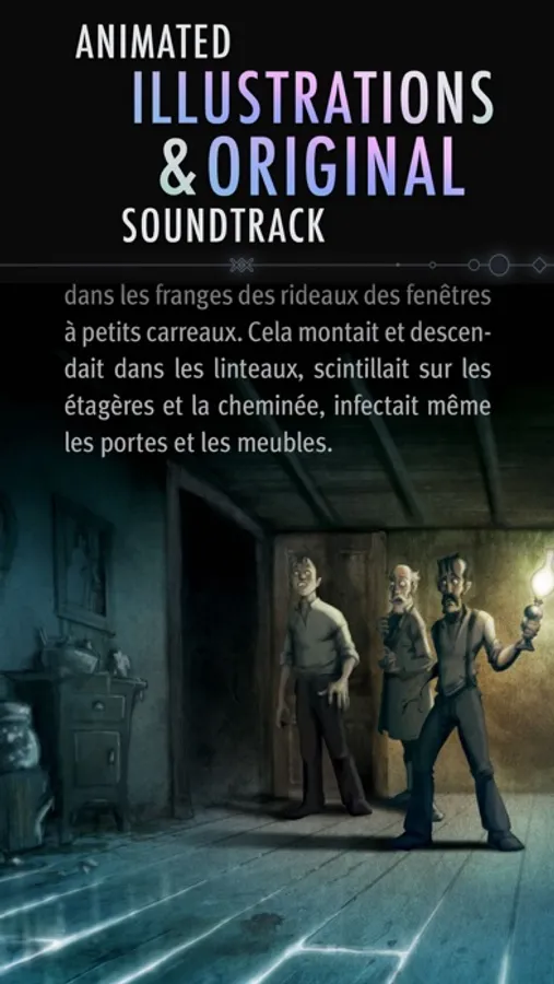 Read, listen, play and move your device, to dive into the story like you've never done before. Going much further than reading a text with illustrations; the experience has animated and interactive scenes, coupled with sound effects, careful design and an original soundtrack, all joined together to immerse yourself in the bowels of one of the H.P. Lovecraft’s most acclaimed stories in an unprecedented way.