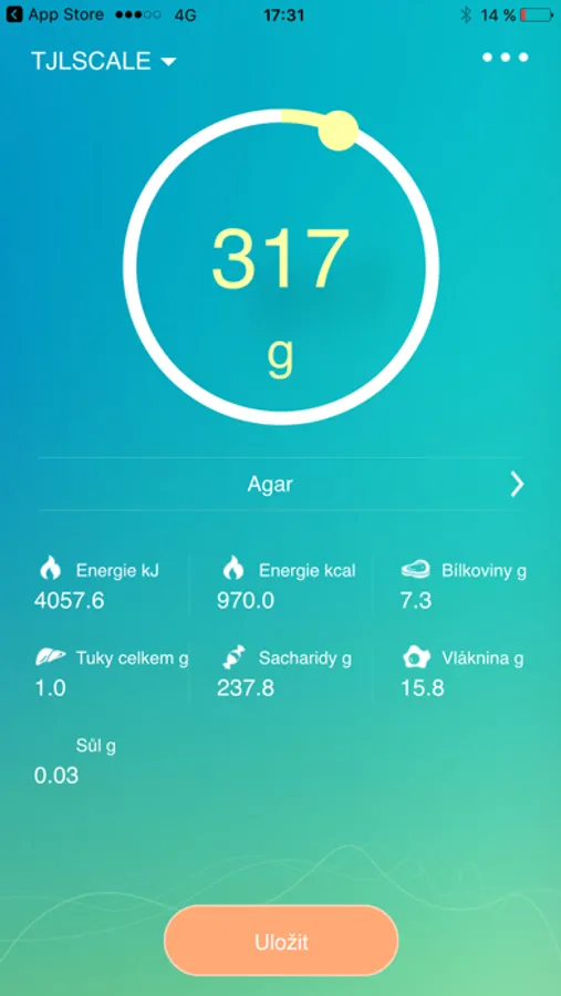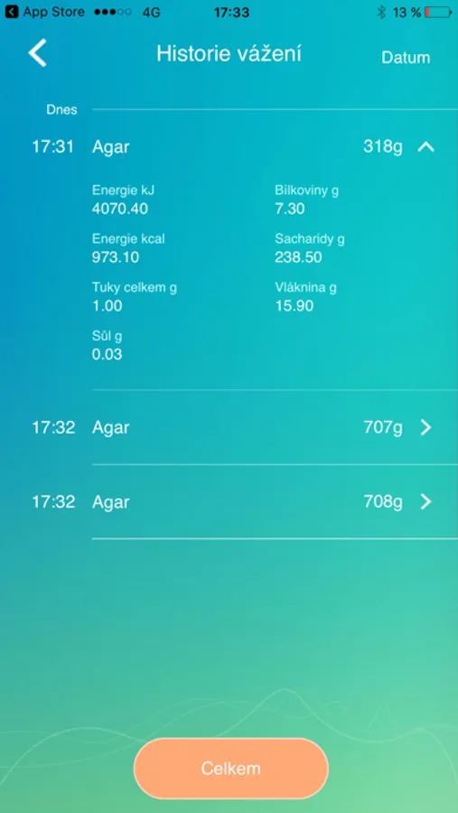 - Možnost sledování historie vážení a sčítání nutričních hodnot různých surovin, včetně uložení výsledné potraviny do historie vážení