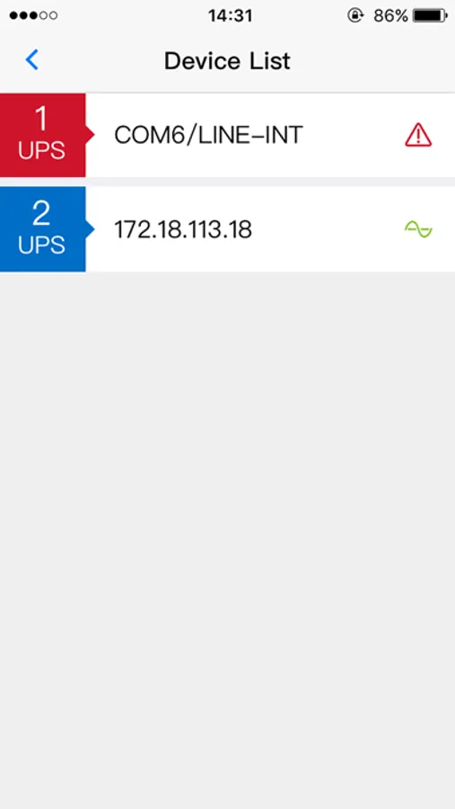 Input the Winpower server address: http://IP address:8888 in APP, such as http://172.18.140.50:8888. Once APP connects the server OK, all the UPS communicating with Winpower will be shown in the list.