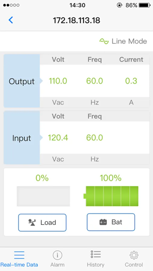 Click UPS name in the UPS list, the real-time data about the UPS will be shown. The detail information includes UPS input, output, battery parameter and UPS status. User can click “Load” or “Bat” button for detail information about load or battery.