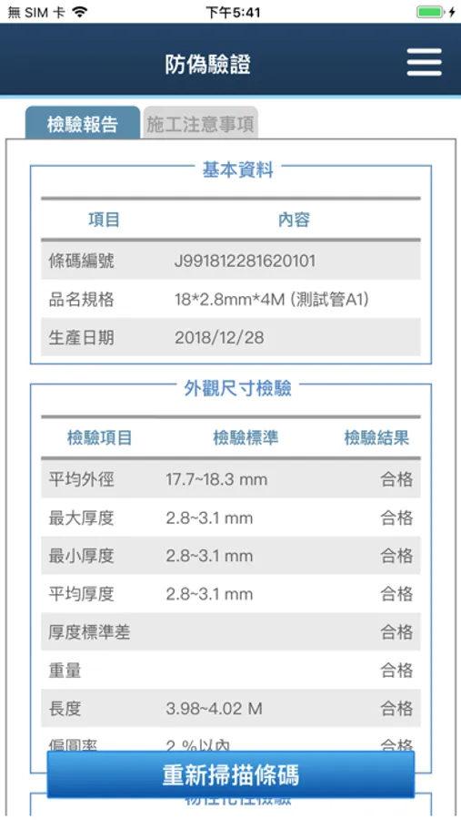 【檢驗報告檢視】-確認此PVC管為南亞產品,並可進一步檢視此南亞PVC管的品質檢驗報告。