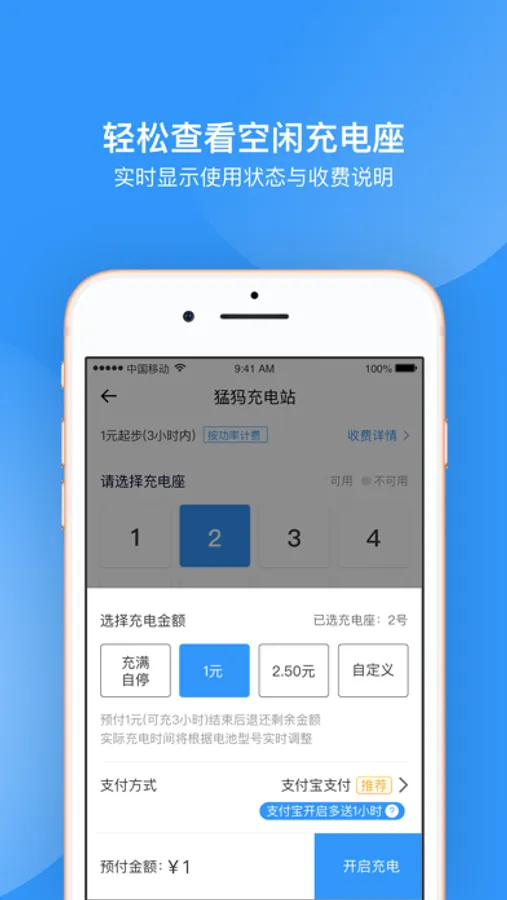 - 实时显示充电插座使用状态,轻松查找空闲充电座