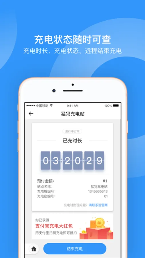 - 随时查看充电状态,远程结束充电