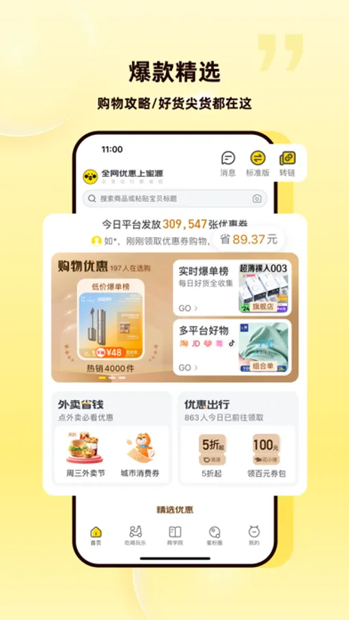 优惠覆盖美团外卖、饿了么、携程、飞猪、优惠加油,生活处处有优惠,有事没事上蜜源,更多惊喜等你发现
