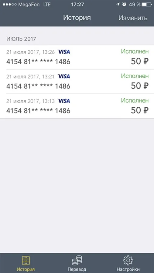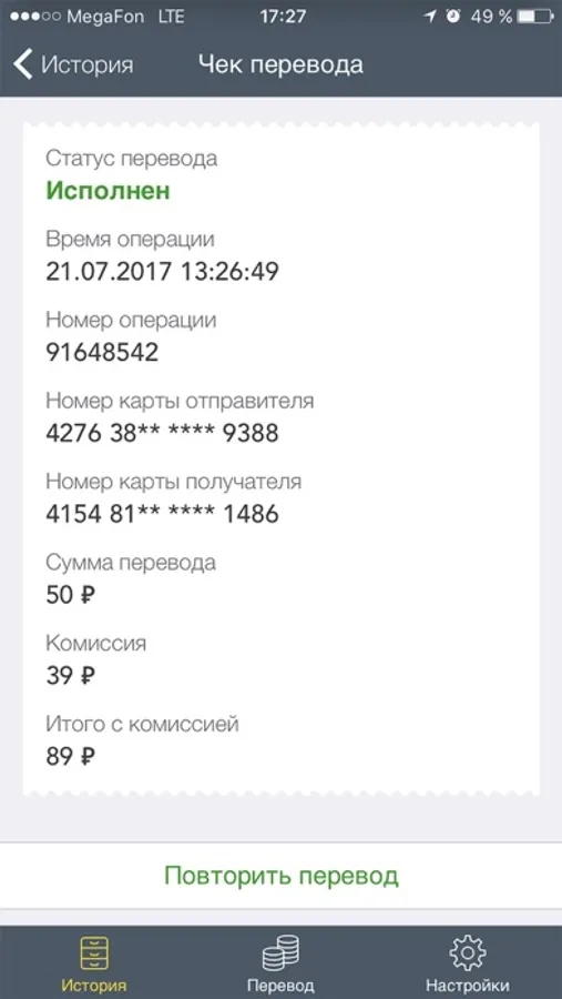 - Совершает повторные переводы без ввода карты отправителя/получателя;
